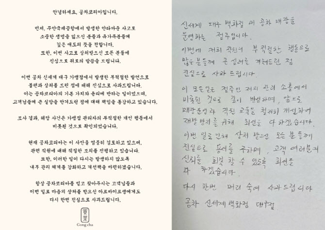 '제주항공 참사 망언' 공차 매장 자필 사과문 공개